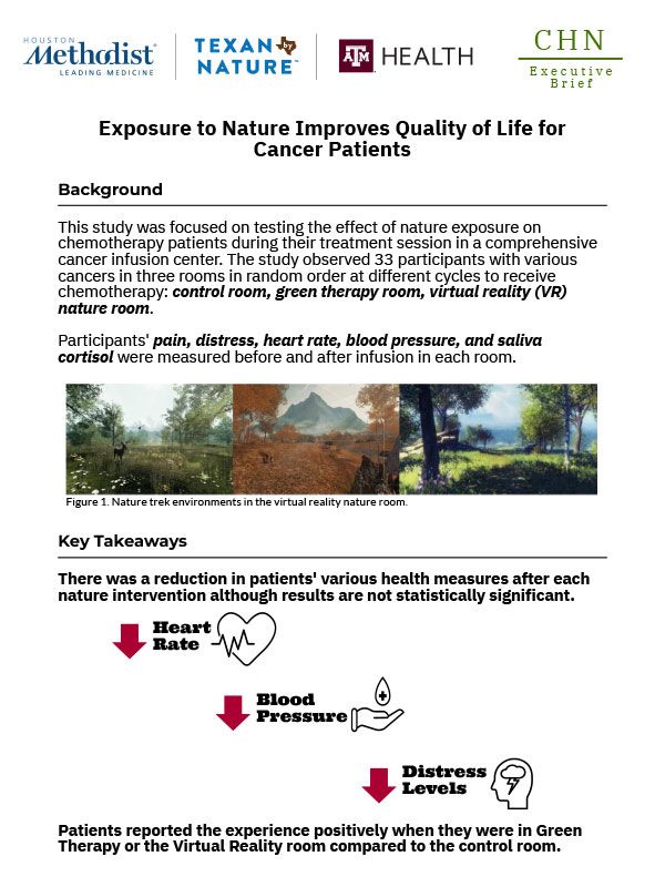 This study was focused on testing the effect of nature exposure on chemotherapy patients during their treatment session in a comprehensive cancer infusion center. The study observed 33 participants with various cancers in three rooms in random order at different cycles to receive chemotherapy: control room, green therapy room, virtual reality (VR) nature room.