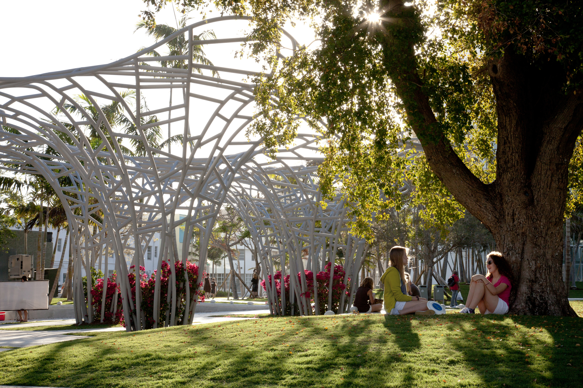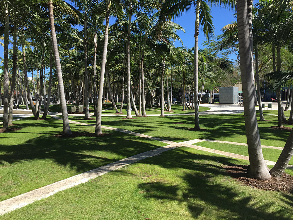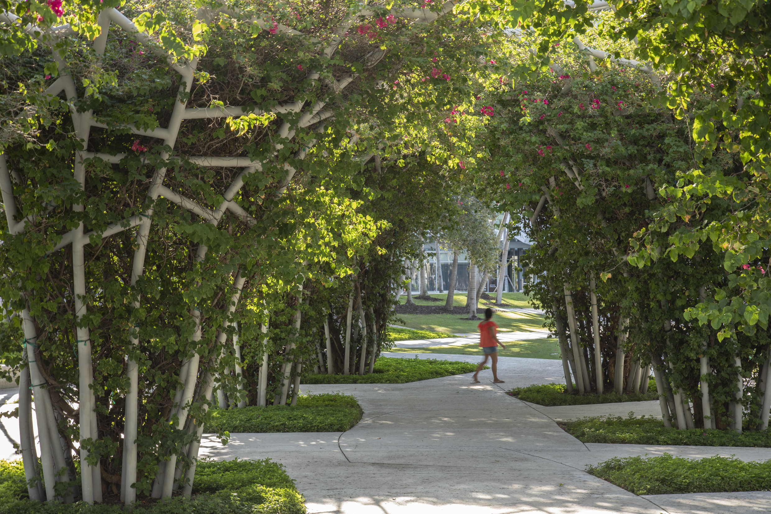 One of the design challenges was the small size — just 2.5 acres — combined with its urban locale and ambitious programming plans. The edges of the park were planted with palms to create a visual and auditory buffer. The soft undulations in topography are echoed by concrete seating walls and meandering white concrete pathways that also serve to connect the park to surrounding neighborhoods. The 355 newly planted trees provide shade, providing welcome relief from South Florida's intense sun and heat. Fifteen custom-fabricated pergolas welcome visitors to the site and create dappled shade.
