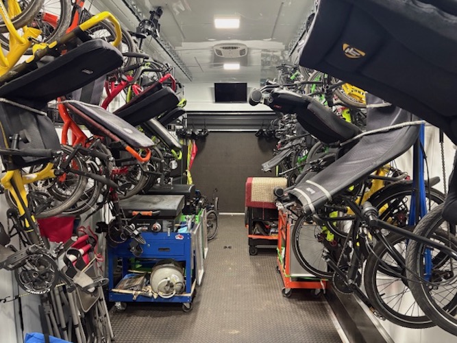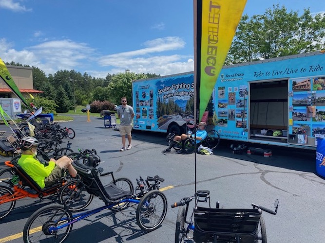 Spokes has 18 recumbent trikes in our trailer, which travels the USA as we provide presentations and clinics for the introduction of recumbent trikes to participants. Presentation venues include hospitals, bike rallies, rehab centers, health expos, State Parks, support groups, and Rail to Trail's events.